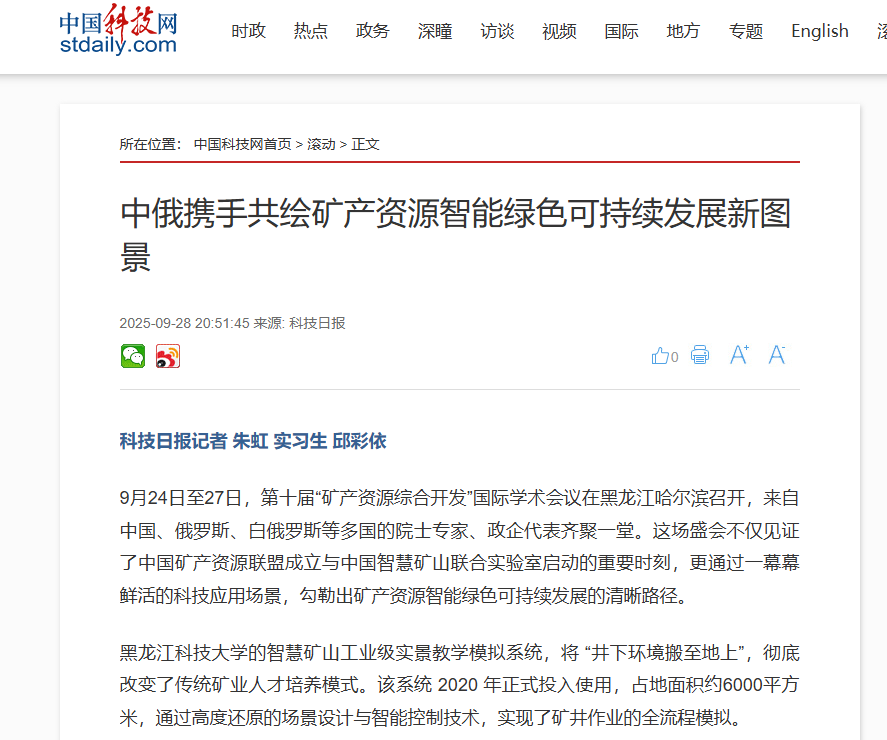 为深入落实中俄两国元首关于加强矿产领域协作的重要共识,9月26日,由黑龙江科技大学与俄罗斯科学院哈巴罗夫斯克研究中心共同发起的中俄智慧矿山联合实验室正式揭牌运行。同日,双方组织召开中俄矿产资源联盟圆桌会议,审议通过联盟章程并签署合作协议,为中俄矿产领域合作搭建了新平台、注入了新动力。当日上午,中俄智慧矿山联合实验室揭牌仪式在黑龙江科技大学碳谷大厦举行。校长孟上九与俄罗斯科学院院士、哈巴罗夫斯克联邦...