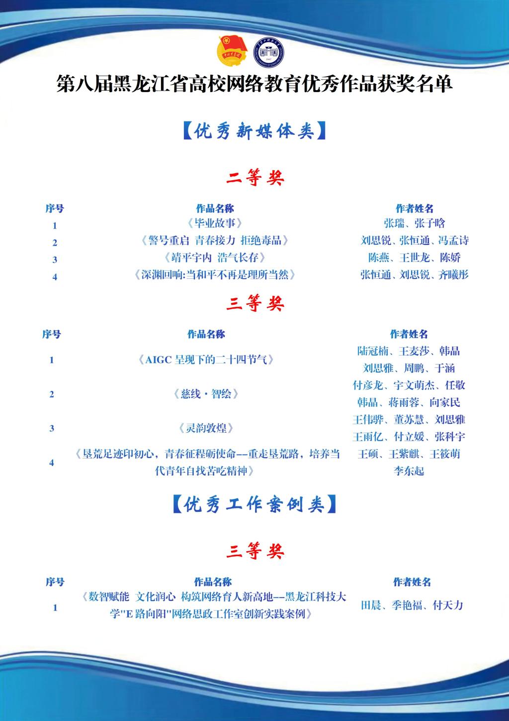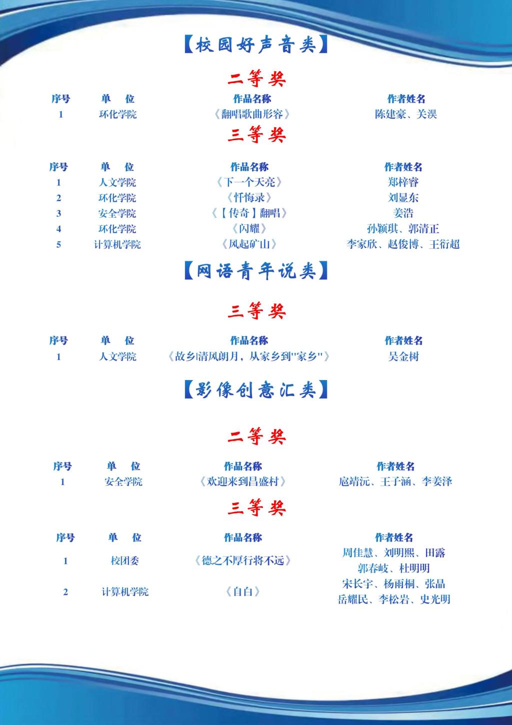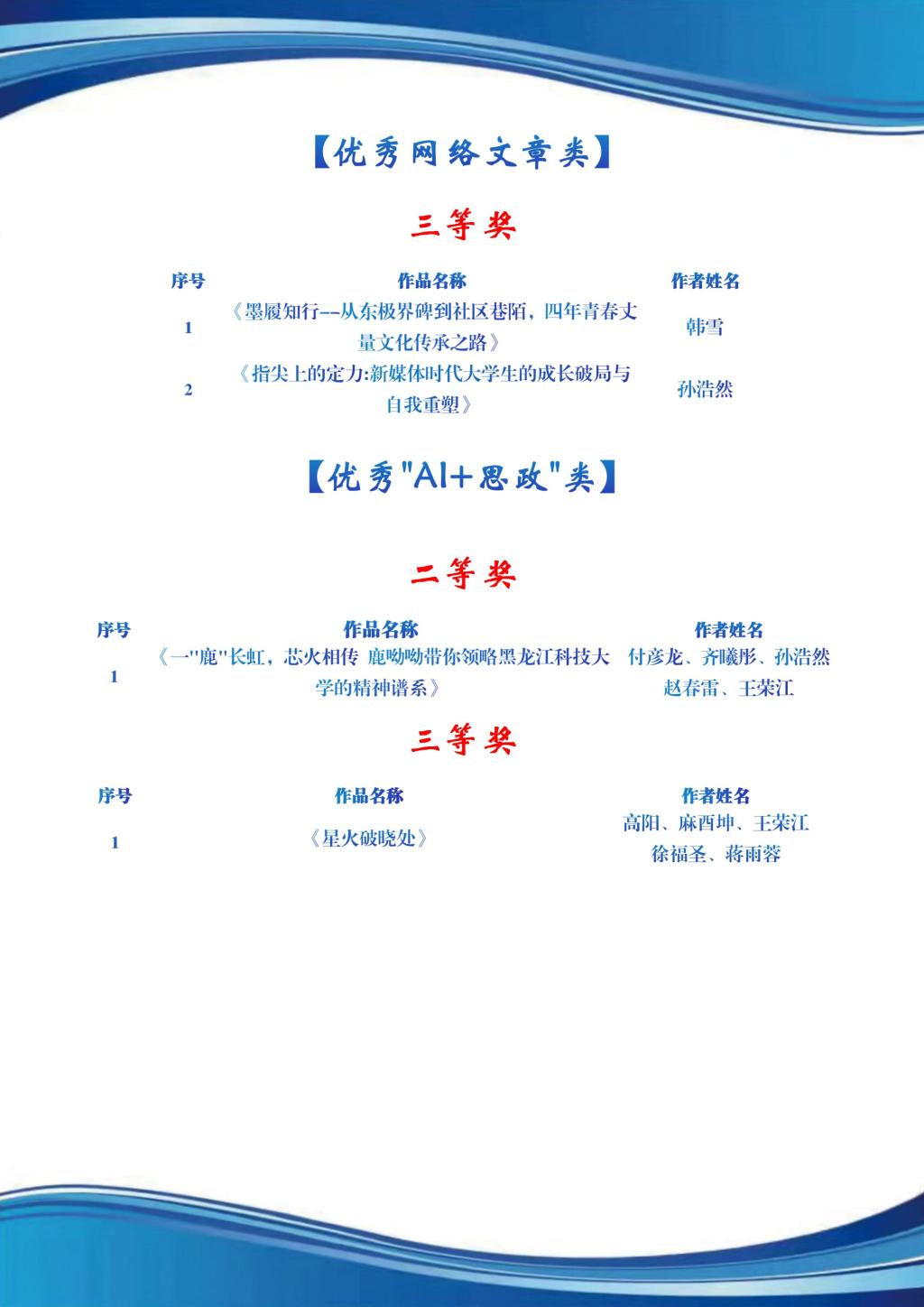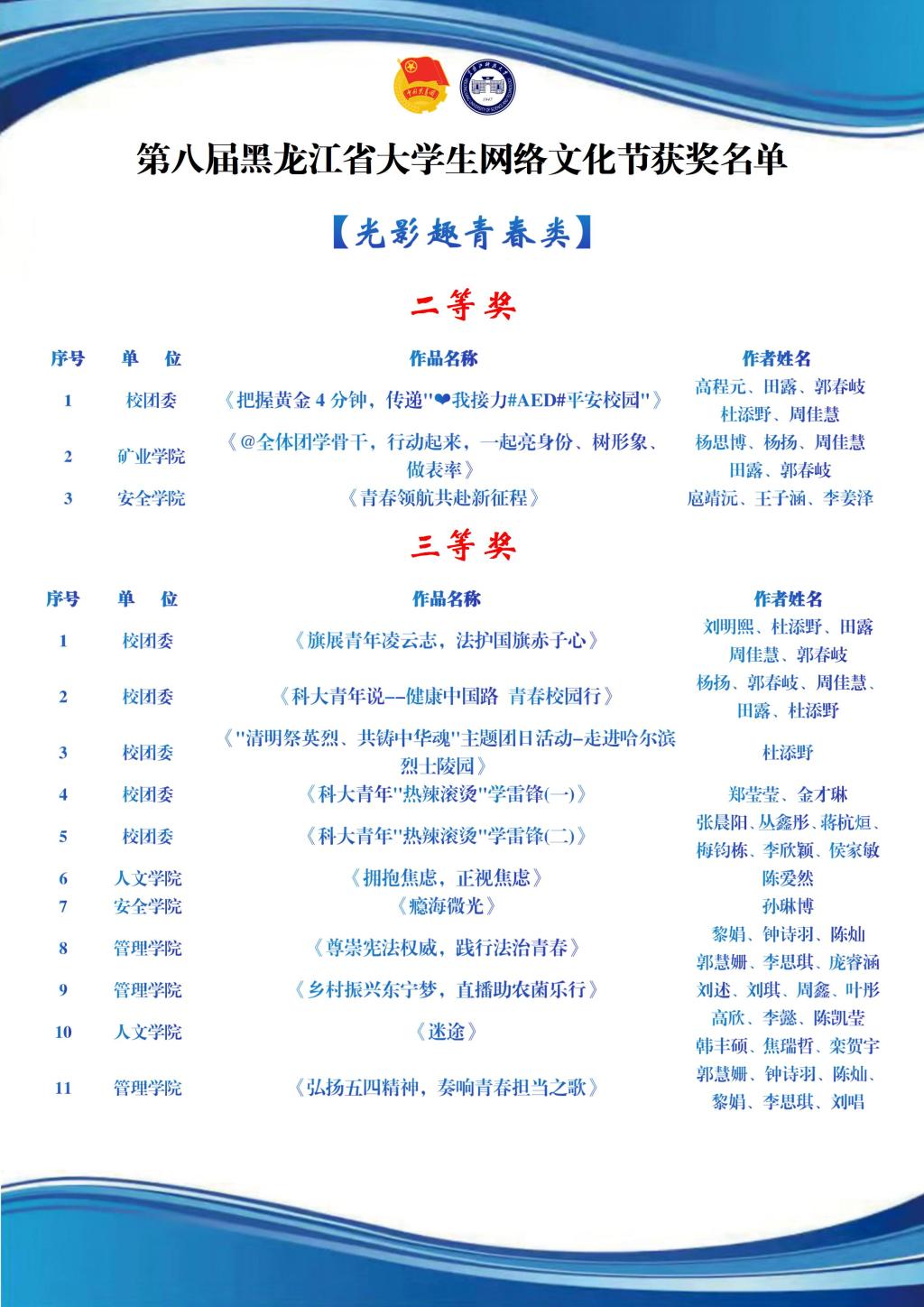此次评选中,我校青年学生在全省大学生网络文化节的光影趣青春、影像创意汇等7个赛道中表现夺目,共有31项作品获奖,其中,二等奖9项、三等奖22项;我校教师在全省高校网络教育优秀作品推选展示活动中成果丰硕,共有13项作品获奖,其中,二等奖5项、三等奖8项。获奖作品紧扣“争做校园好网民,汇聚网络正能量,奋进强国新征程”的主题,政治导向正确、内容积极向上、形式新颖多样,展现了科大青年让网络空间主旋律更加高昂、正能量更加充沛的青春风貌,凝聚了我校教师创新网络育人机制与载体,充分发挥网络文化活动滋养人心、凝聚力量的积极作用,彰显了我校网络文化建设的扎实成效与育人成果。
