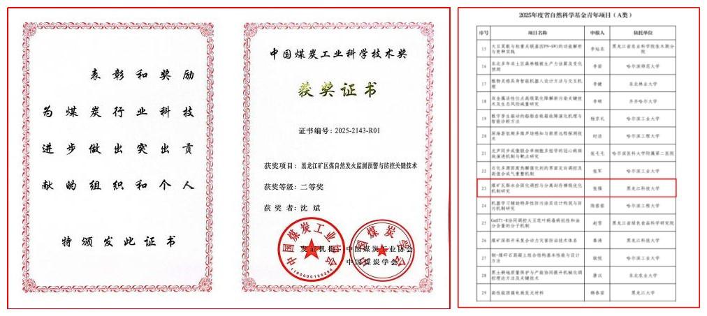 学院扎实推进学科团队建设,2025年,4名教师入选校级特色学科青年创新团队,学科团队负责人及成员获批国家自然科学基金区域创新发展联合基金重点项目1项;首次获批国家科技重大专项青年科学家项目,实现该类项目零的突破;获批黑龙江省自然科学基金青年a类项目1项。科研工作成效显著,获中国煤炭工业协会科学技术一等奖1项、二等奖1项,黑龙江省科技进步二等奖1项,中国职业健康协会科学技术二等奖1项。